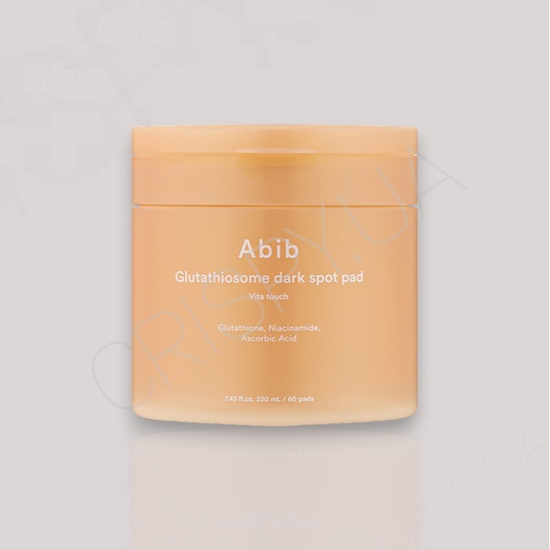 Abib Glutathiosome Dark Spot Pad Vita Touch — тонізувальні педи з глутатіоном та вітамінним комплексом, які освітлюють пігментацію, вирівнюють тон шкіри та повертають їй природне сяйво. Педи м’яко оновлюють шкіру, зволожують та покращують її загальний стан.