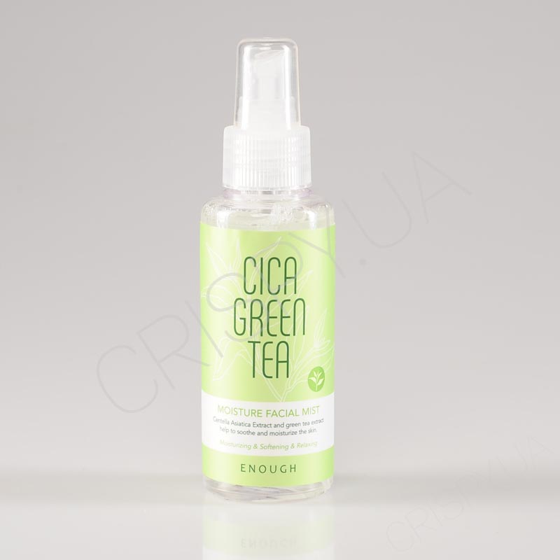 Міст з екстрактами камелії та центели Enough Cica Green Tea Moisture Facial Mist для зволоження подразненої, проблемної, сухої, в'яне, вікової шкіри обличчя. Усуває запалення, почервоніння, бореться із висипанням. Має заспокійливу, відновлюючу, протизапальну дії. Пригнічує надмірне вироблення меланіну, який утворює пігментні плями. Має очищувальну властивість, попереджає появу прищів і допомагає позбутися наявних. Повертає особі природне сяйво, чистоту, рівномірність тону.