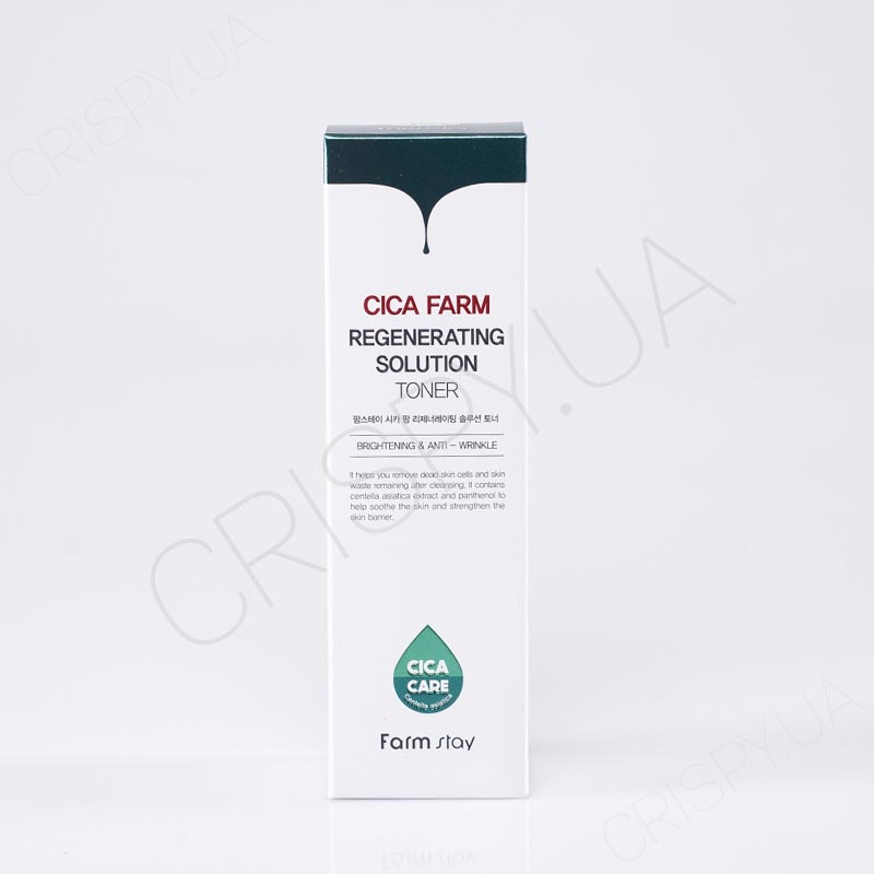Тонер з центелою азіатською та мадекасосидом FARMSTAY CICA FARM REGENERATING SOLUTION TONER для лікування та відновлення пошкодженої, зневодненої, чутливої, запаленої, зрілої шкіри. Заспокоює подразнення, чинить протизапальну, антибактеріальну дію. Очищає від висипу вугрів, загоює ранки, гнійнички. Освітлює постакне, пігментні плями.