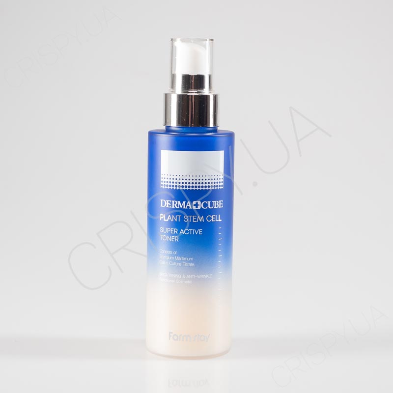Тонер зі стовбуровими клітинами морських рослин FARMSTAY DERMA CUBE PLANT STEM CELL SUPER ACTIVE TONER для відновлення зрілої, тьмяної, в'янучої шкіри обличчя, що втратила пружність. Чинить ліфтинг-дію, підтягує дерму, мінімізує вікові зміни. Інтенсивно зволожує, протистоїть зневодненню клітин, утворенню лущення, загрубілих ділянок. Освітлює пігментні плями, вирівнює тон. Надає особі сяйва, чистоти, свіжого вигляду. Очищає пори від закупорок, сприяє їхньому звуженню. Усуває запалення, заспокоює подразнення.