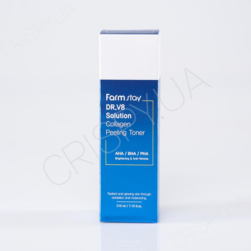 Пілінг-тонер з АНА-ВНА-РНА кислотами та колагеном FARMSTAY DR.V8 SOLUTION COLLAGEN PEELING TONER для догляду за віковою, потьмянілою, жирною, комбінованою, проблемною шкірою. Має м'яку дію, що відлущує, освітлює пігментні плями, сліди від прищів. Вирівнює тон, повертає йому яскравість, однорідність. Має ліфтингову дію, бореться зі зморшками та віковими змінами. Розгладжує поверхню шкіри, покращує її текстуру. Пом'якшує огрубілі ділянки, усуває лущення. Надає обличчю чистоти, здорового сяйва.