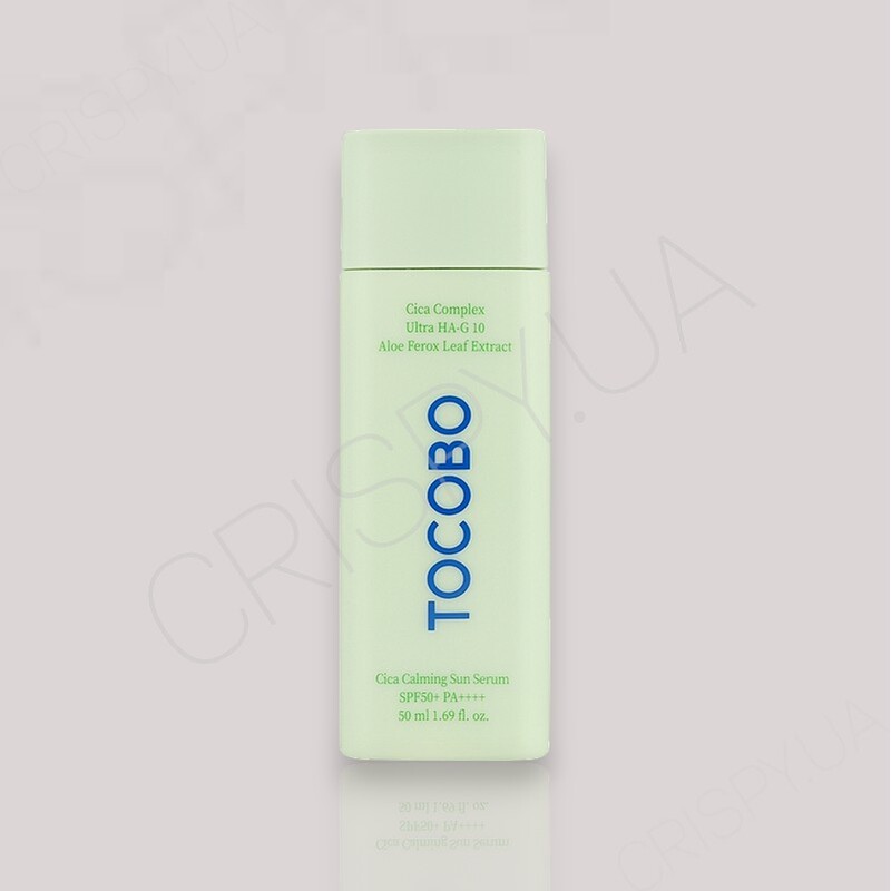 TOCOBO Cica Calming Sun Serum SPF50+ PA++++ — заспокійлива сонцезахисна сироватка з центелою азійською, яка забезпечує надійний захист від UVA та UVB-променів, інтенсивно зволожує шкіру та зменшує подразнення. Легка сироваткова текстура швидко вбирається, не залишає липкості та білого нальоту.